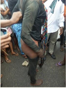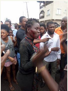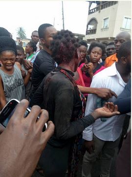 The accused young woman who could be seen with tattered clothes and bloodied head was later led by an irate mob to an undisclosed location.