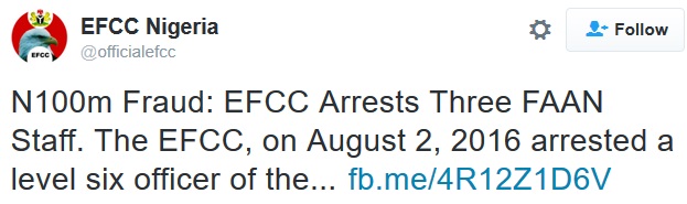 The Economic and Finanacial Crimes Commission (EFCC), on August 2, 2016 arrested a level six officer of the Accounts Department of the Federal Airports Authority of Nigeria (FAAN), Christy Olabode, for an alleged fraud to the tune of N100 million.