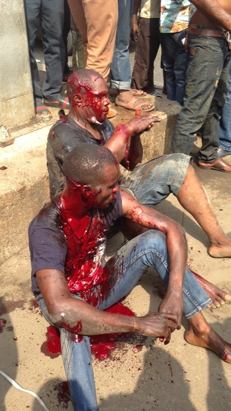 According to a Twitter user who shared the photos online, some armed robbers were this afternoon, caught after a failed robbery operation at Fadeyi, very close to Jibowu in the Lagos metropolis and thoroughly beaten.