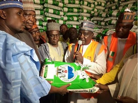 In line with the Memorandum of Understanding (MOU) signed with the National Emergency Management Agency, NEMA and Borno state Government on provision of food items for the feeding of Internally Displaced Persons residing in camps across Maiduguri, the Zonal Coordinator NEMA North East Alh Muhammed Kanar handed over the food items provided by the Federal Government for the feeding of IDPs to the Deputy Governor of Borno state Alh Usman Durkwa and Executive chairman Borno state Emergency Management Agency, BOSEMA; Eng Ahmed Satomi at the Agency's North East store premises Maiduguri, Borno state.