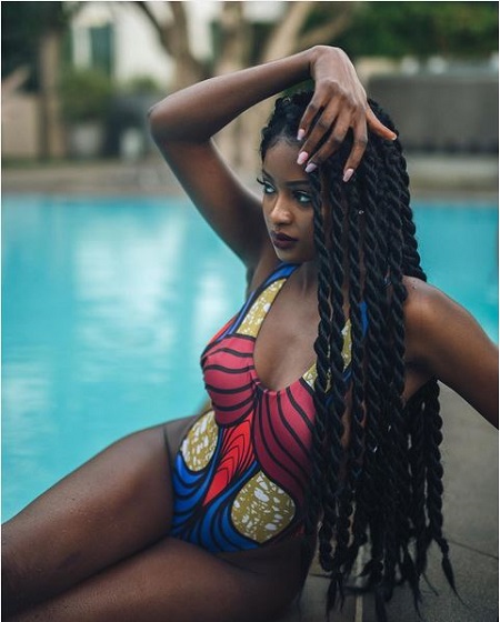 The Guinean model posed by a pool for Bfyne, a Nigerian designer in a stunning photoshoot session shot in California, United States of America for their latest Ankara swimwear campaign.