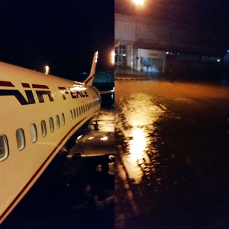 From the photos shared, there was ankle deep water on the runway and passengers were also stranded in the plane as there was no bus to convey them to the arrival lounge.