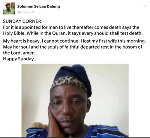 In yet another shocking news which emerged online this Sunday morning, the Minister of Sports, Solomon Dalung, has taken to his Facebook to announce that his first wife has passed on.