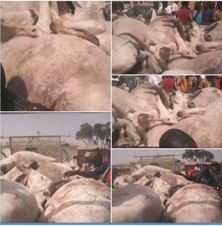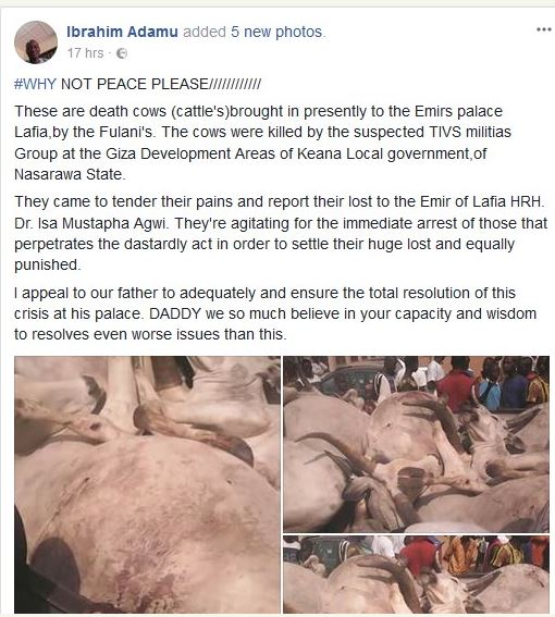 "These are death cows (cattle's)brought in presently to the Emirs palace Lafia,by the Fulani's. The cows were killed by the suspected TIVS militias Group at the Giza Development Areas of Keana Local government,of Nasarawa State.