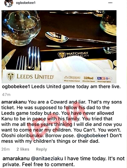 The mother-of-three commented on Ogbonna's post on Instagram and wrote, ”You are a coward and liar. That’s my son’s ticket. He was supposed to follow his dad to the Leeds game today but no. You have never allowed Kanu to be at peace with his family.