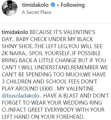 "IF POSSIBLE BRING BACK A LITTLE CHANGE BUT IF YOU CAN'T I WILL UNDERSTAND,REMEMBER WE CAN'T BE SPENDING TOO MUCH,WE HAVE 3 CHILDREN AND SCHOOL FEES DON'T PLAY AROUND LEKKI . MY VALENTINE @busoladakolo..